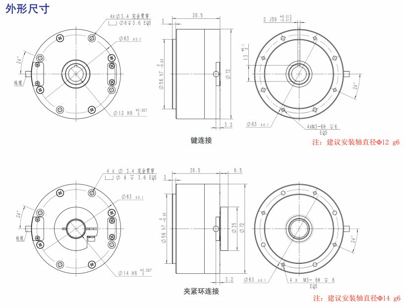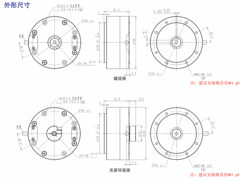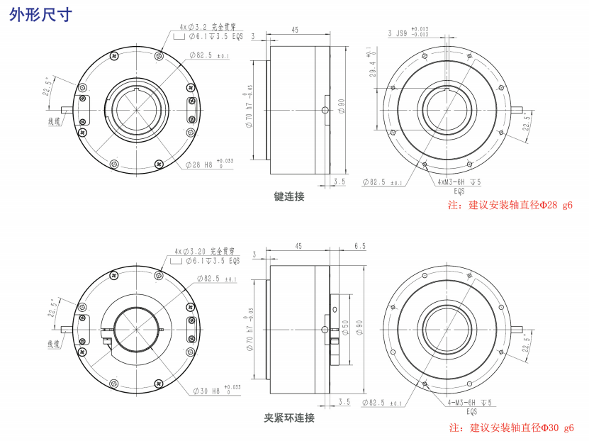 ●轉軸形式:同心軸通孔,夾緊環(huán)/鍵兩種連接形式(二選一)。